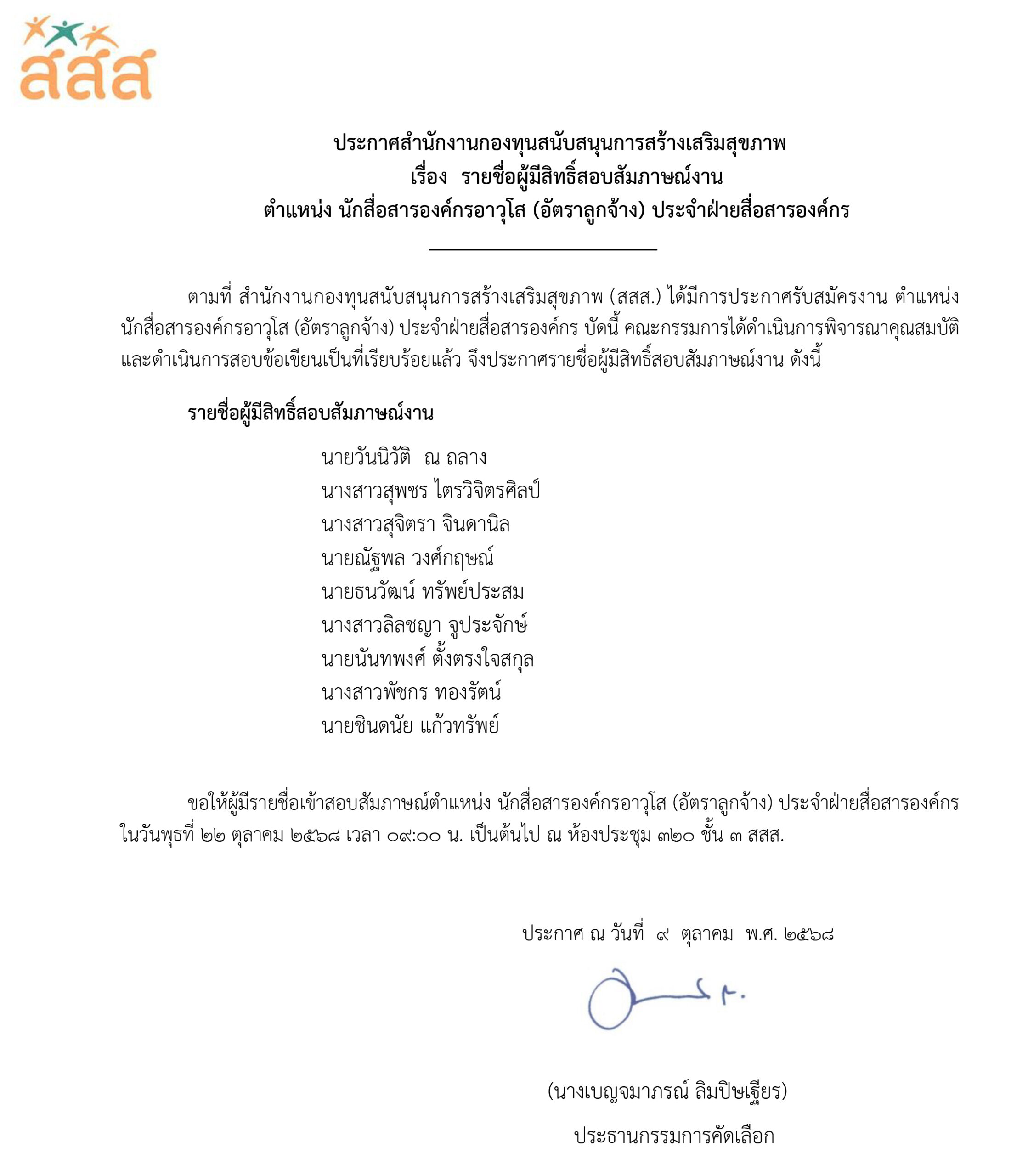 รายชื่อผู้มีสิทธิ์สัมภาษณ์งาน ตำแหน่ง นักสื่อสารองค์กรอาวุโส (อัตราลูกจ้าง) ประจำฝ่ายสื่อสารองค์กร
